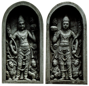 The human form in the Guardstones is a representation of the Naga (Cobra) King appearing as a celestial prince and the body standing with a slight curve to imitate the movement of the cobra. In one hand he holds a flower pot of plenty (punkalasa) and in the other a sprouting branch of prosperity, complete with leaves, buds and flowers.