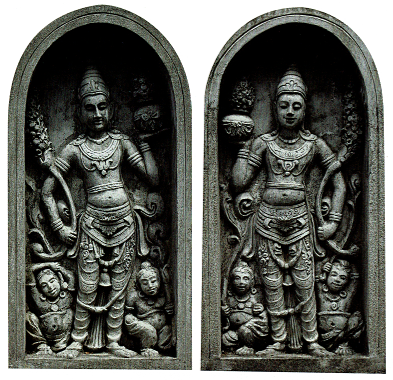 The two dwarfs, Sankha (conch shells) and Padma (lotus) have been diminished to two minor figures at the feet of the Naga King. Their head dresses take the shape of the lotus and conch shells